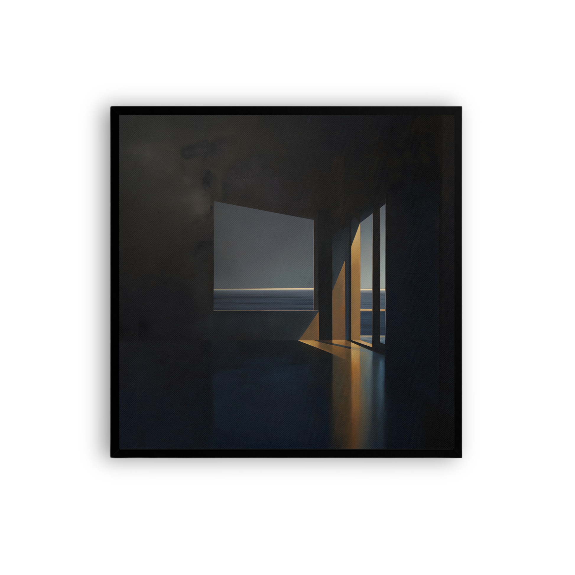 Step into a world where stillness meets precision with our Minimalist Coastal Light Wall Art. This striking canvas captures the interplay of architectural geometry, warm sunlight, and the infinite calm of the ocean horizon. Deep shadowed walls frame a serene expanse of blue, while golden rays pour through an open doorway, casting luminous reflections across the floor.